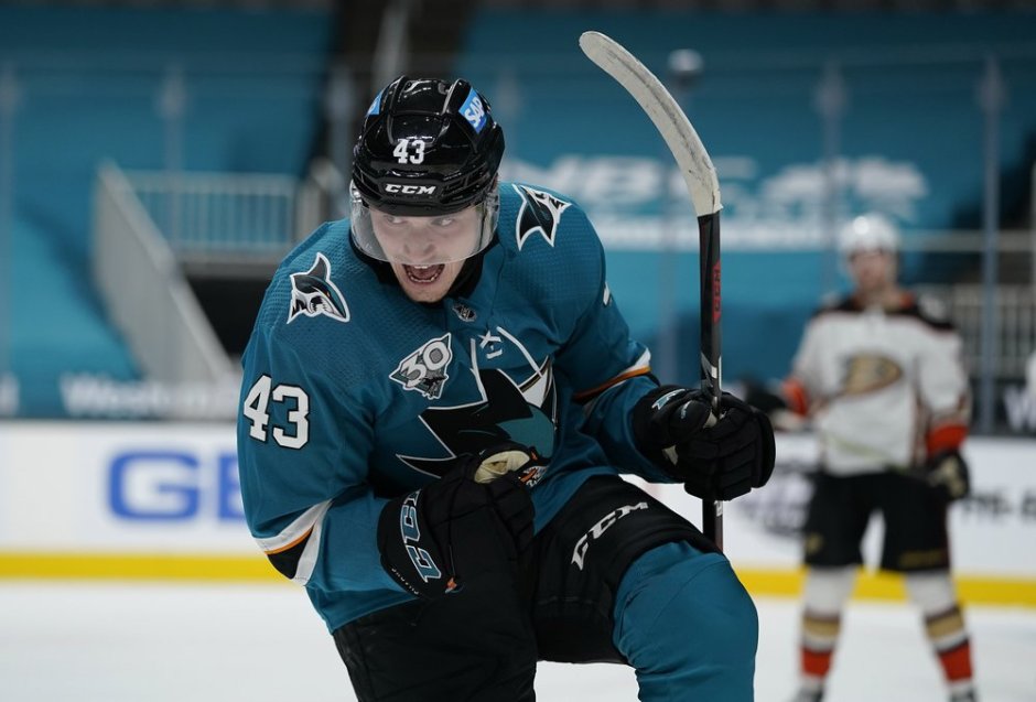 The San Jose Sharks John Leonard (43) is fired up after scoring a first period goal against the visiting Anaheim Ducks at SAP Center in San Jose on Mon Feb 15, 2021 (AP News photo)
