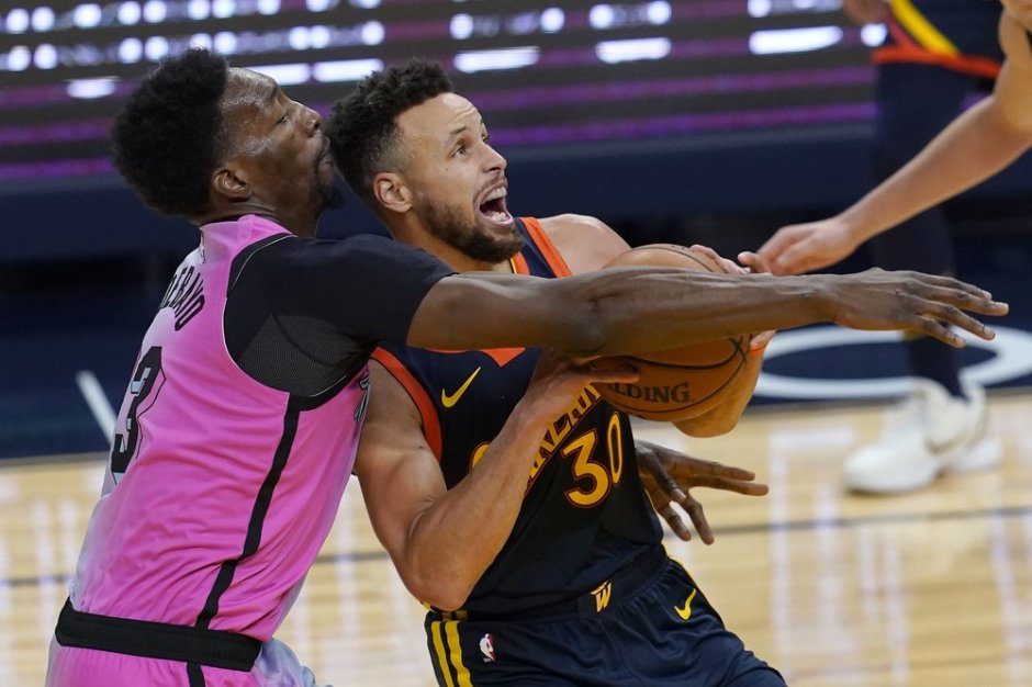 The Golden State Warriors Stephen Curry (30) is fouled by Miami Heat center Bam Adebayo (left) in the second half at Chase Center in San Francisco on Wed Feb 17, 2021 (AP News photo)
