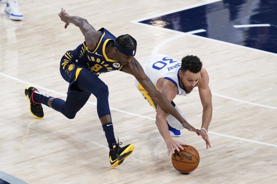 The Indiana Pacers Justin Holiday (8) and the Golden State Warriors Stephen Curry (30) chase down the basketball in the second half of Wed Feb 24, 2021’s NBA contest in Indianapolis (AP News photo)