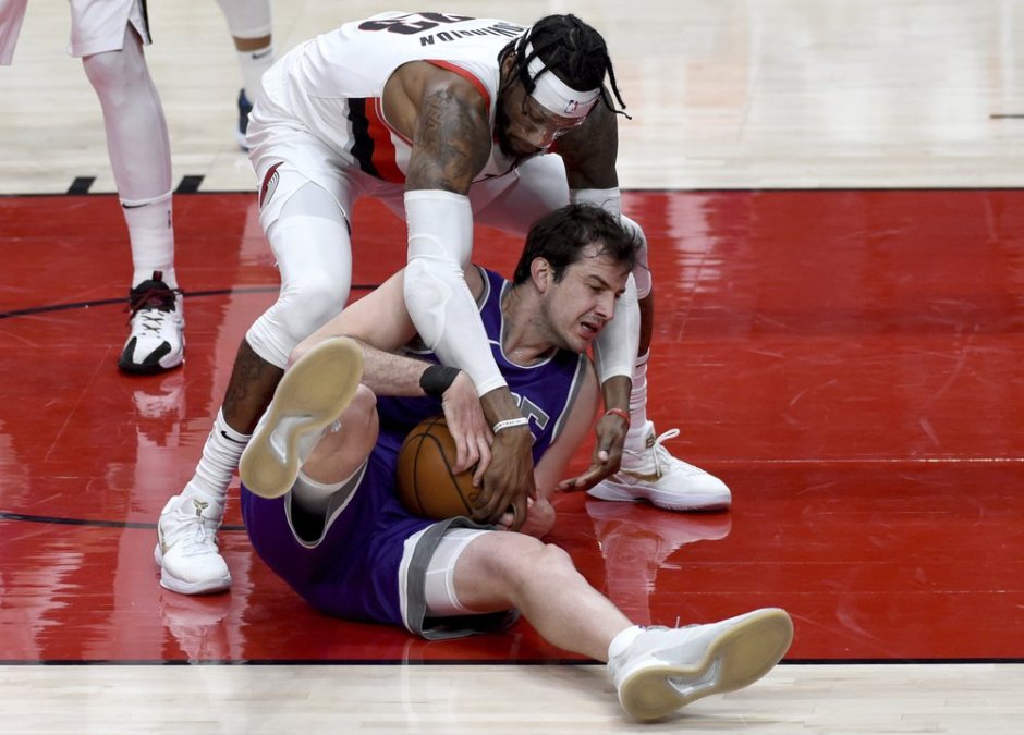 The Portland Trailblazers forward Robert Covington tried prying the ball out of the hands of the Sacramento Kings forward Nemanja Bjelica during first half action Thu Mar 4, 2021’s contest in Portland (AP News photo)