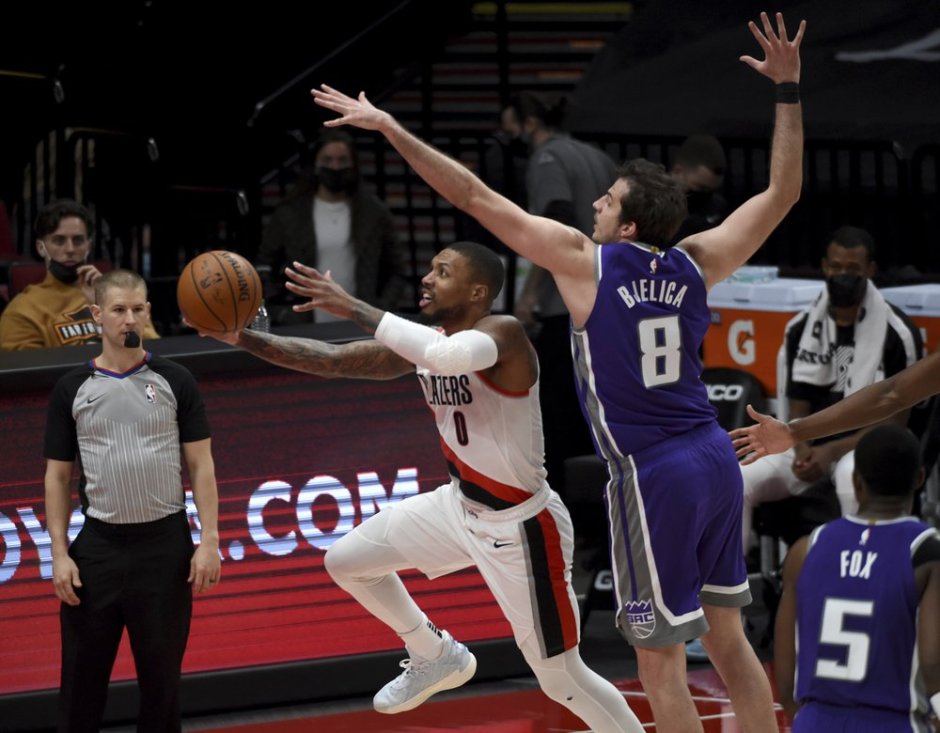 The Portland Trailblazers guard Damion Lillard (0) goes for the lay up against the Sacramento Kings forward Nemanja Bjelica (8) on Thu Mar 4, 2021 in Portland (AP News photo)