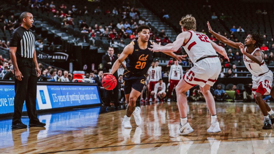 The Cal Bears Matt Bradley guard (20) brings the ball down against Stanford forward James Keefe (22) during the Pac 12 Tournament at the T-Mobile Center in Las Vegas on Wed Mar 10, 2021 (photo from Cal MBB twitter)