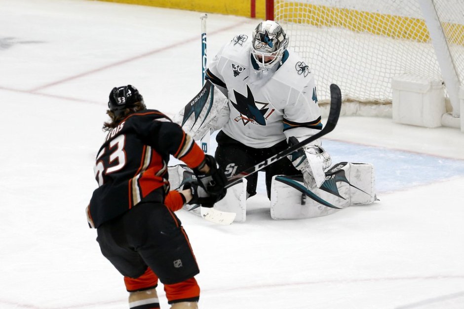 The San Jose Sharks goaltender Devon Dubnyk (1) gets in front of Anaheim Ducks forward Maxime Comtois (53) third period shot on Fri Mar 12, 2021 at SAP Center in San Jose (AP News photo)