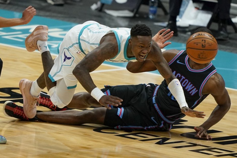 Charlotte Hornets guard Tony Rozier and the Sacramento Kings forward Harrison Barnes can’t hold onto the loose ball during the second half in Charlotte on Mon Mar 15, 2021 (AP News photo)