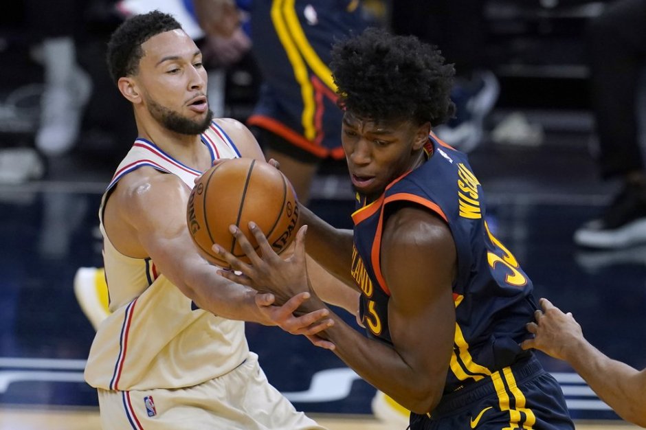 Golden State Warriors rookie center James Wiseman (right) looks overwhelmed by defender Ben Simmons center of the Philadelphia 76ers on Tue Mar 23, 2021 at the Chase Center in San Francisco (AP News photo)