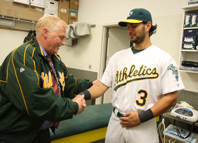 Oakland A’s physician Dr. Allan Pont has currently been with the A’s for 38 years pictured with former A’s third baseman Eric Chavez ( file photo by Michael Zagaris)