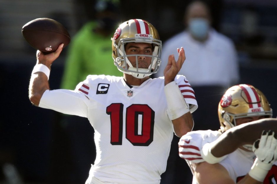 San Francisco 49ers quarterback Jimmy Garoppolo throws against the Seattle Seahawks defense during their contest Nov 1, 2020 in Seattle (AP News file photo)