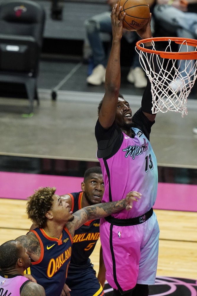 Miami Heat center Bam Adebayo (13) throws down on the Golden State Warriors center Kevin Looney (5) and guard Kelly Oubre Jr on Thu Apr 1, 2021 in Miami (AP News photo)