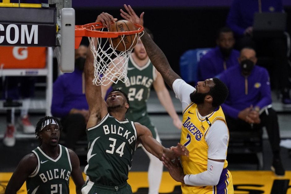 The Milwaukee Bucks forward Giannis Antetokounmpo (34) throws down on the Los Angeles Lakers Andre Drummond (2) on Wed Mar 31, 2021 in the Staples Center in Los Angeles as the Lakers come visit the Golden One Center tonight against the Sacramento Kings (AP News photo)