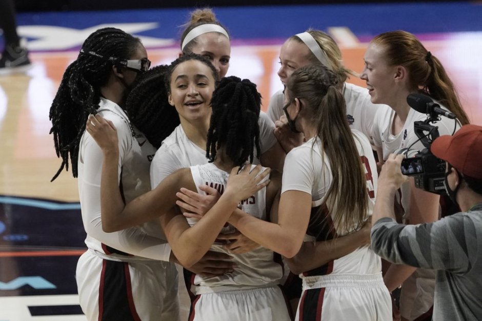 Stanford Cardinal women celebrate winning the Final Four against the South Carolina Gamecocks in San Antonio to advance to the Women’s Championship on Sunday Apr 4, 2021 (AP News photo)
