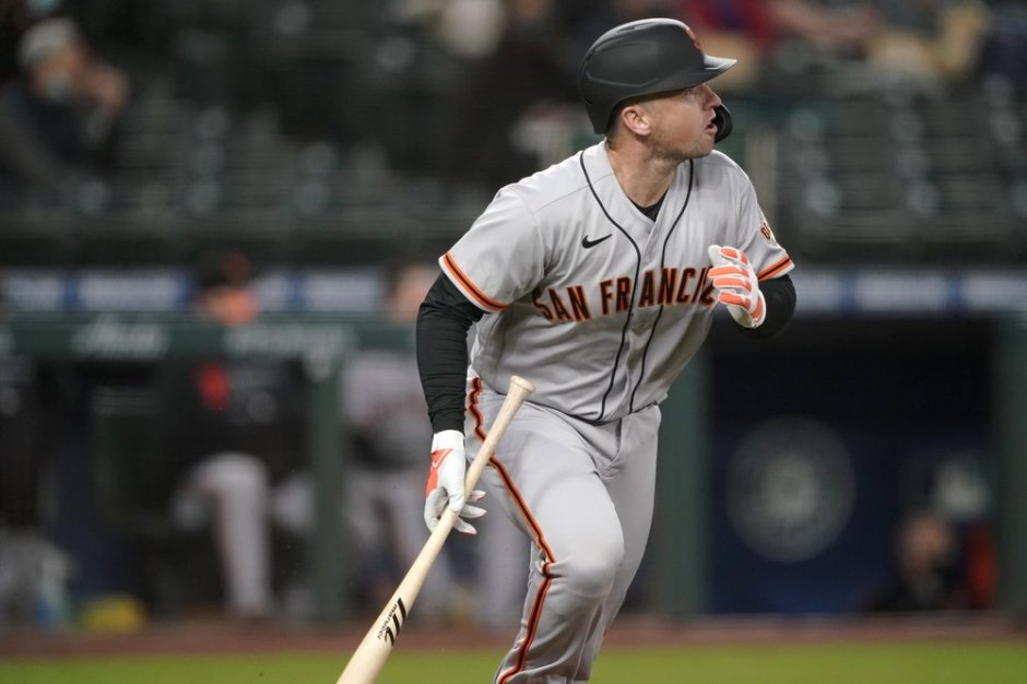 San Francisco Giants hitter Buster Posey goes deep with a third inning home run against the Seattle Mariners at T Mobile Field on Fri Apr 2, 2021