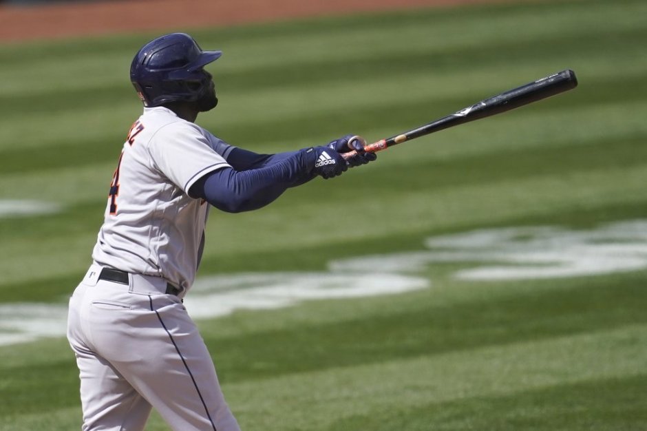 Hit high the Houston Astros Yordan Alvarez says “good bye baseball” with a three run fourth inning home run against the Oakland A’s at the Oakland Coliseum on Sat Apr 3, 2021 (AP News photo)