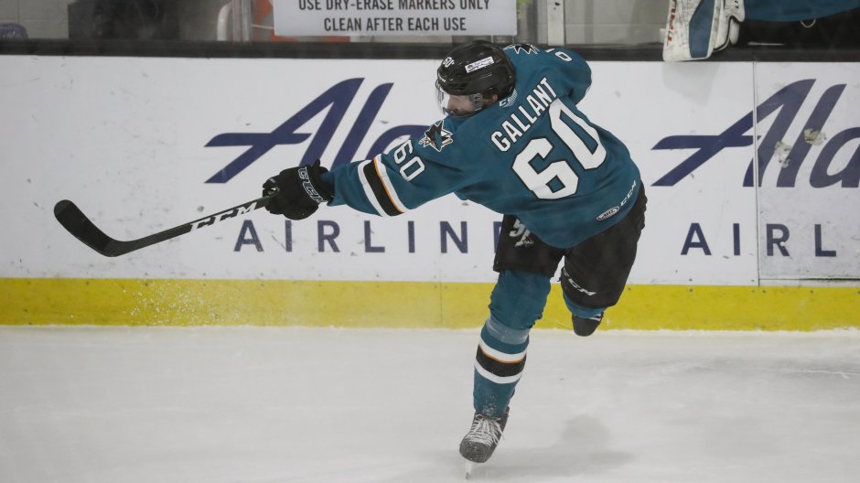 The San Jose Barracuda forward Zach Gallant (60) takes a shot against the Bakersfield Condors on Tue Mar 30, 2021 in Bakersfield (@sjbarracuda photo)