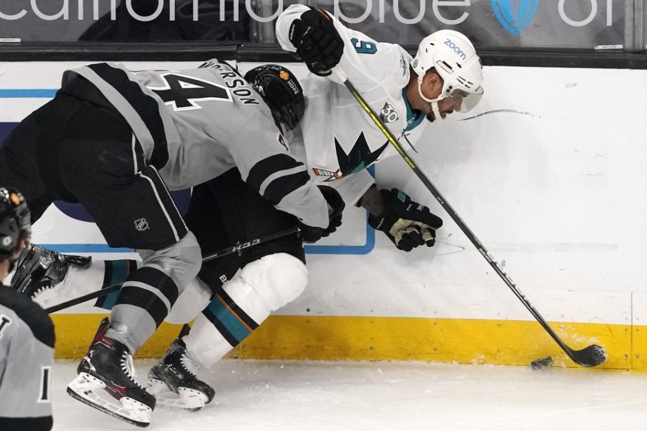 The Los Angeles Kings defenceman Mikey Anderson (left) tries to disrupt the San Jose Sharks left winger Evander Kane’s puck control (right) at Staples Center in Los Angeles on Sat Apr 3, 2021 (AP News photo)