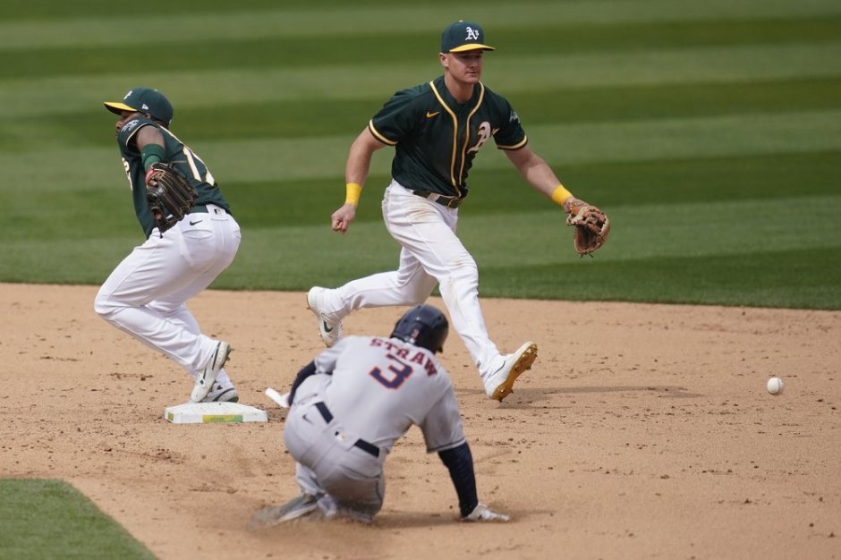 The Houston Astros Myles Straw (3) reaches second base as the Oakland A’s shortstop Elvis Andrus (left) can’t make the catch on a throwing error by third baseman Matt Chapman (right) on Sun Arp 4, 2021 at the Oakland Coliseum (AP News photo)