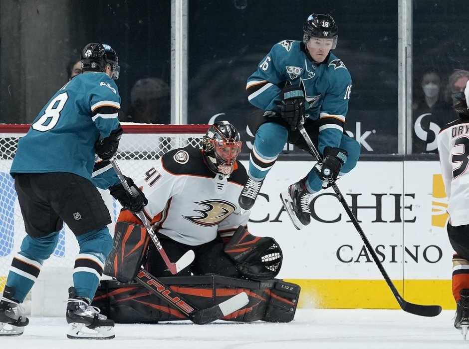 San Jose Sharks center Ryan Donato (16) jumps to get out of the way of Anaheim Ducks goaltender Anthony Stolarz (41) in the second period at the Honda Center in Anaheim on Mon Apr 12, 2021 (AP News photo)