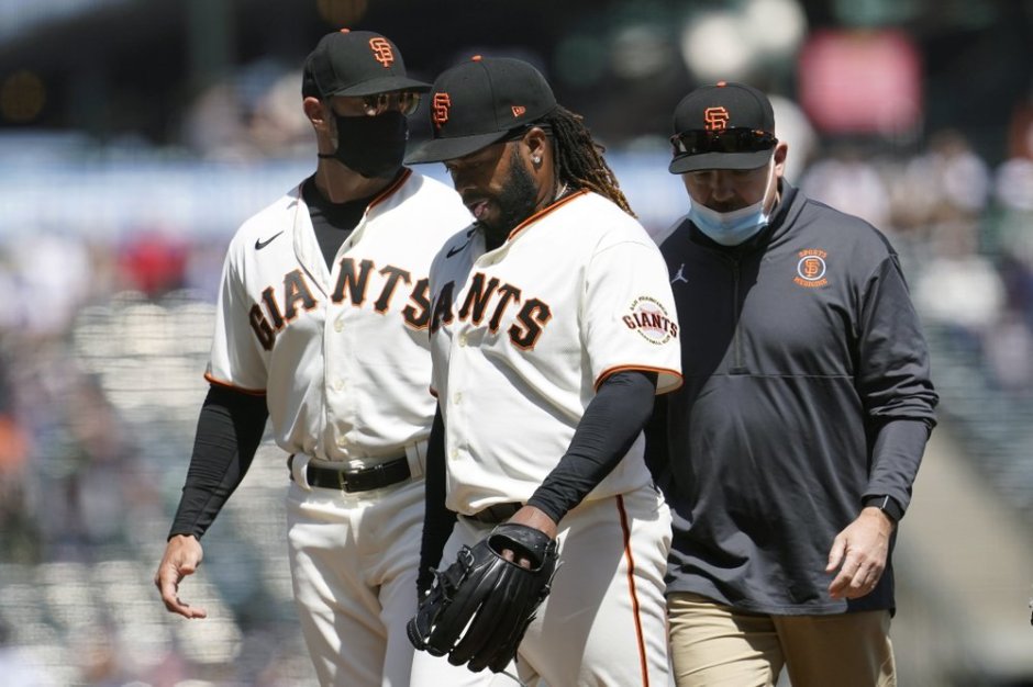 San Francisco Giants starter Johnny Cueto left the game complaining of pain in his pitching arm sharp lat tightness in the top of the sixth inning against the Cincinnati Reds at Oracle Park in San Francisco on Wed Apr 15, 2021 (AP News photo)