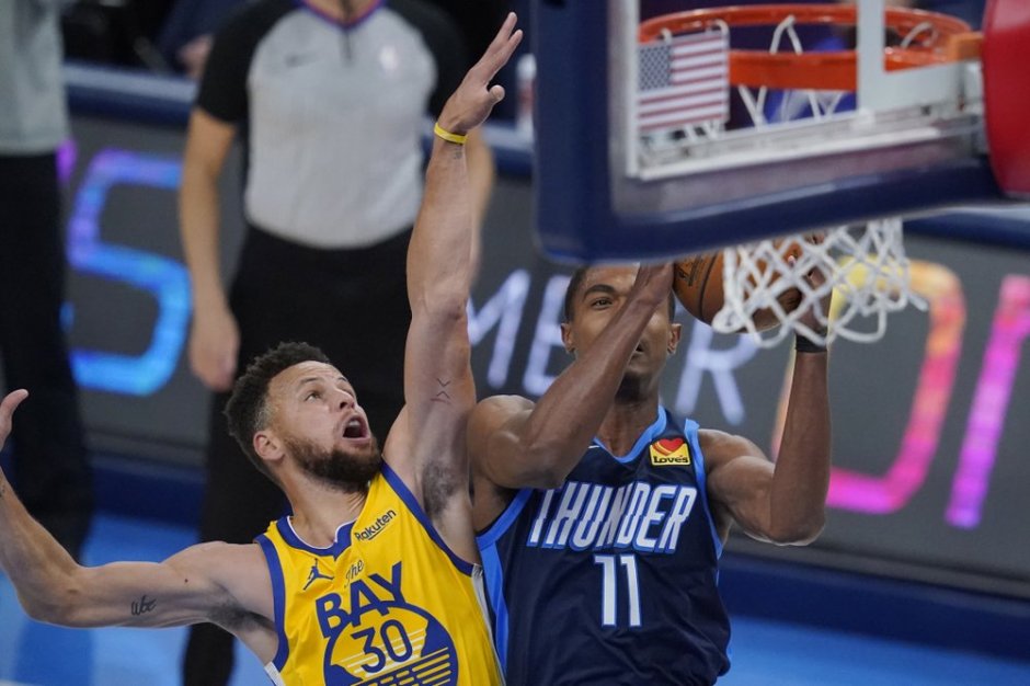 Golden State Warriors guard Stephen Curry (30) defends the Oklahoma City Thunder’s guard Theo Maledon (11) during Wed Apr 14, 2021 game at Chesapeake Energy Arena in Oklahoma City (AP News photo)