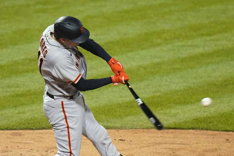 San Francisco Giants hitter Wilmer Flores hits for a three run home run against Philadelphia Phillies pitcher Connor Brogdon on Tue Apr 20, 2021 at Citizens Bank Park in Philadelphia (AP News photo)