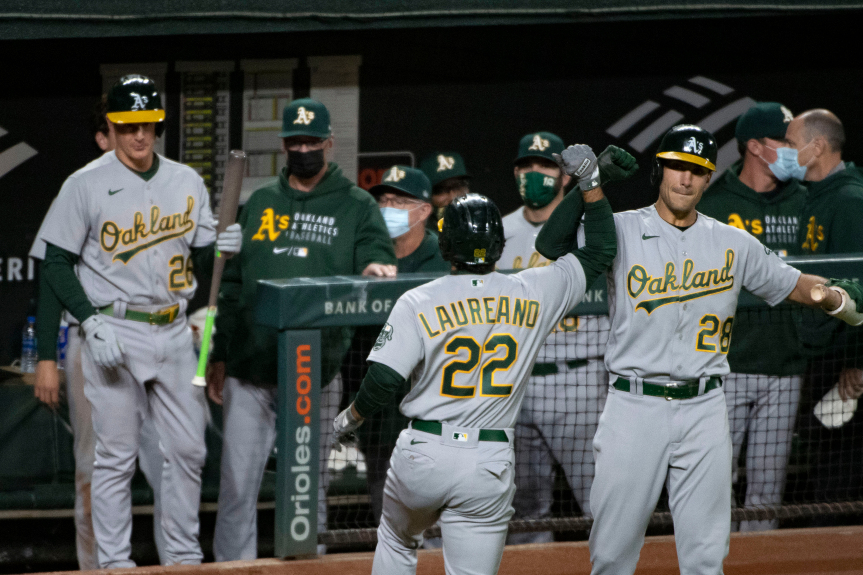 The Oakland A’s Ramon Laureano (22) gets congratulations from Matt Olson (28) after hitting a home run and returning back to the dugout in Baltimore on Fri Apr 23, 2021 (AP News photo)