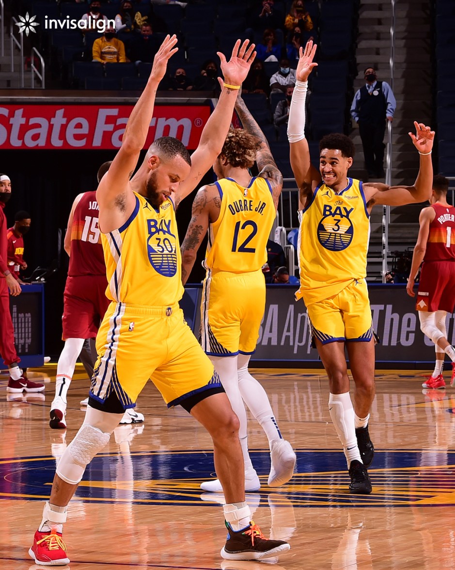 Stephen Curry (30) of the Golden State Warriors exudes with teammates in their victory over the Denver Nuggets on Fri Apr 23, 2021 at the Chase Center in San Francisco (invisalign photo)