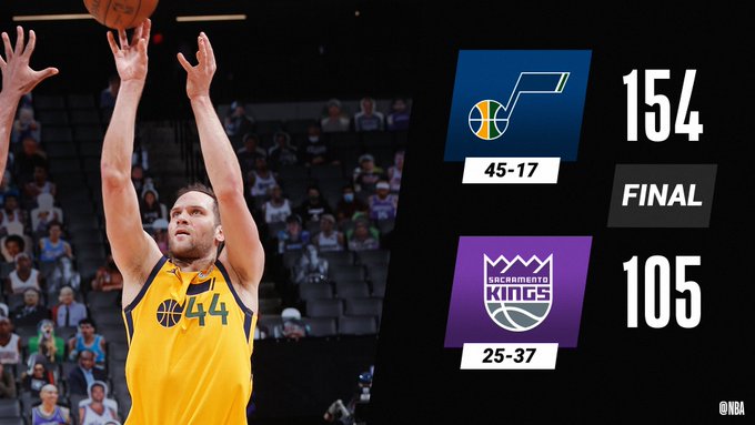 The score says it all as the Sacramento Kings get trounced by the Utah Jazz by 49 points at Golden One Center in Sacramento on Wed Apr 28, 2021 (@JazzNationNews image)