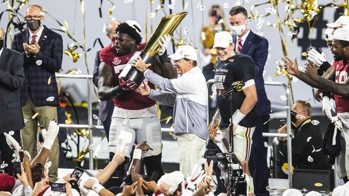 Offensive Tackle Alex Leatherwood who was selected as the 17th pick by the Las Vegas Raiders hoists the championship trophy while a playing for the Alabama Crimson Tide last season (@Raiders photo)