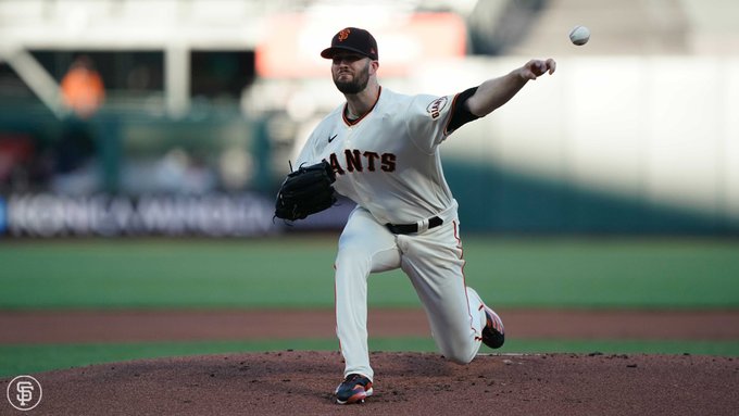 San Francisco Giants starter Alex Wood throws to the Colorado Rockies line up on Wed Apr 28, 2021 at Oracle Park in San Francisco (@SFGiants photo)