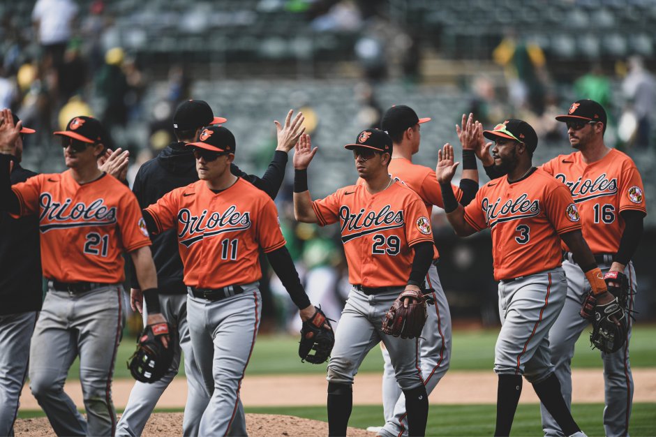 The Baltimore Orioles line up for the hive five post game congratulations following their win over the Oakland A’s Sat May 1, 2021 game at the Oakland Coliseum (photo from USA Today)
