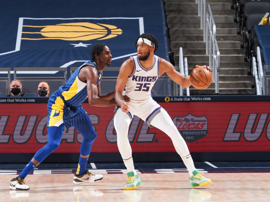 The Sacramento Kings forward Marvin Bagley III takes the ball up court against the Indiana Pacers on Wed May 5, 2021 in Indianapolis. Bagley led the Kings in scoring with 31 points (@SacramentoKings photo)
