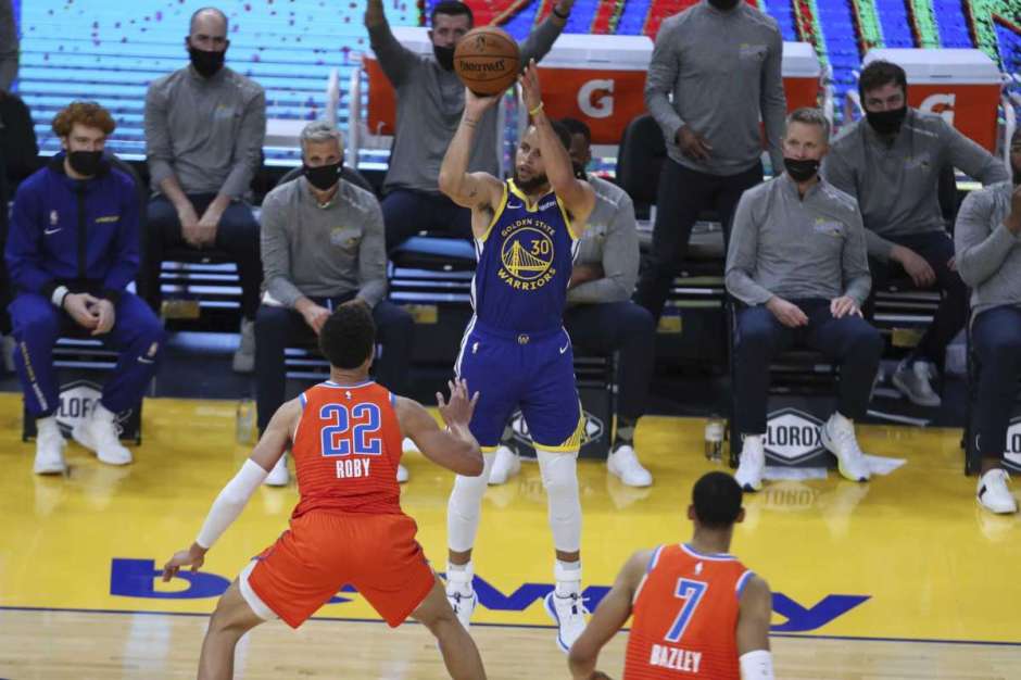 Golden State Warriors Stephen Curry (30) hits a three pointer while being defended by the Oklahoma City Thunder’s Isaiah Roby (22) at the Chase Center in San Francisco on Sat May 8, 2021 (AP News photo)