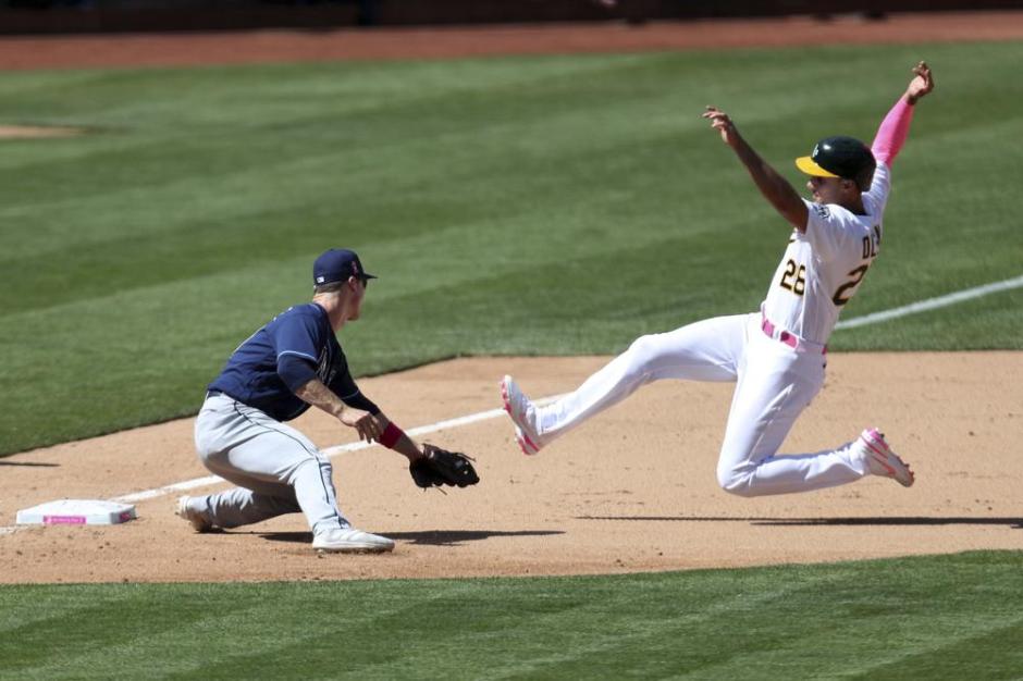 The Tampa Bay Rays third baseman Joey Wendle gets ready to put the tag on the high flying Oakland A’s runner Matt Olson (22) in the eighth inning of Sun May 9, 2021’s game at the Oakland Coliseum (AP News photo)