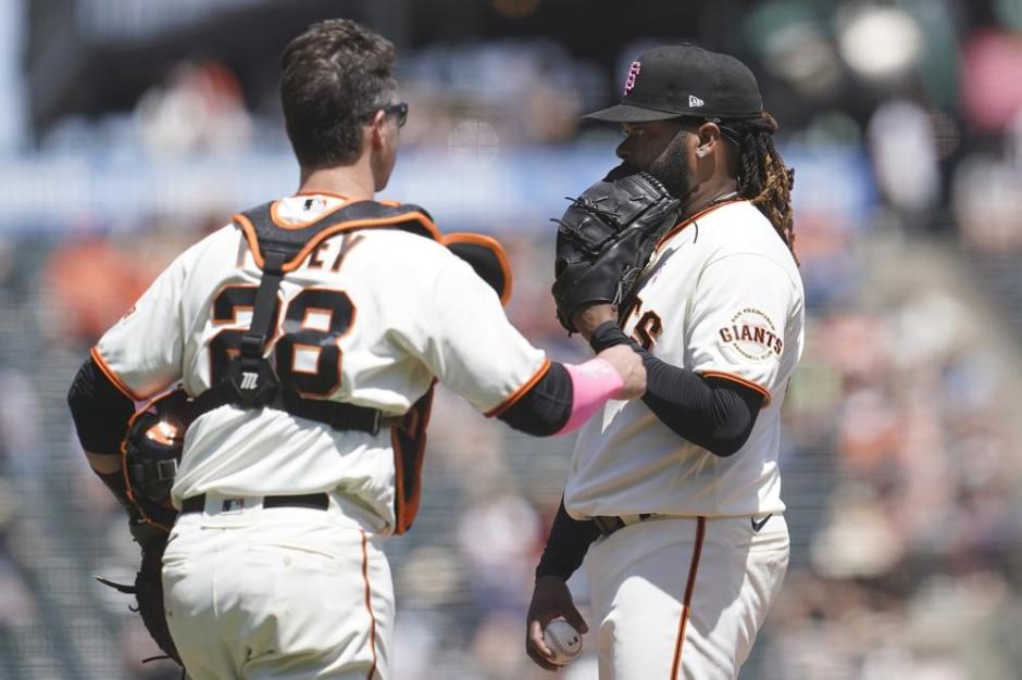 San Francisco Giants starting pitcher Johnny Cueto who got lit up in his first appearance since getting off the injured list to face the San Diego Padres at Oracle Park in San Francisco talks things over with catcher Buster Posey on Sun May 9, 2021 (AP News photo)