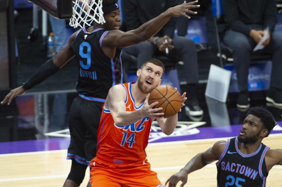 Sacramento Kings guard Terence Davis (9) guards Oklahoma City Thunder guard Svi Mykhailiuk (14) in the first quarter at the Golden One Center in Sacramento on Tue May 11, 2021 (AP News photo)