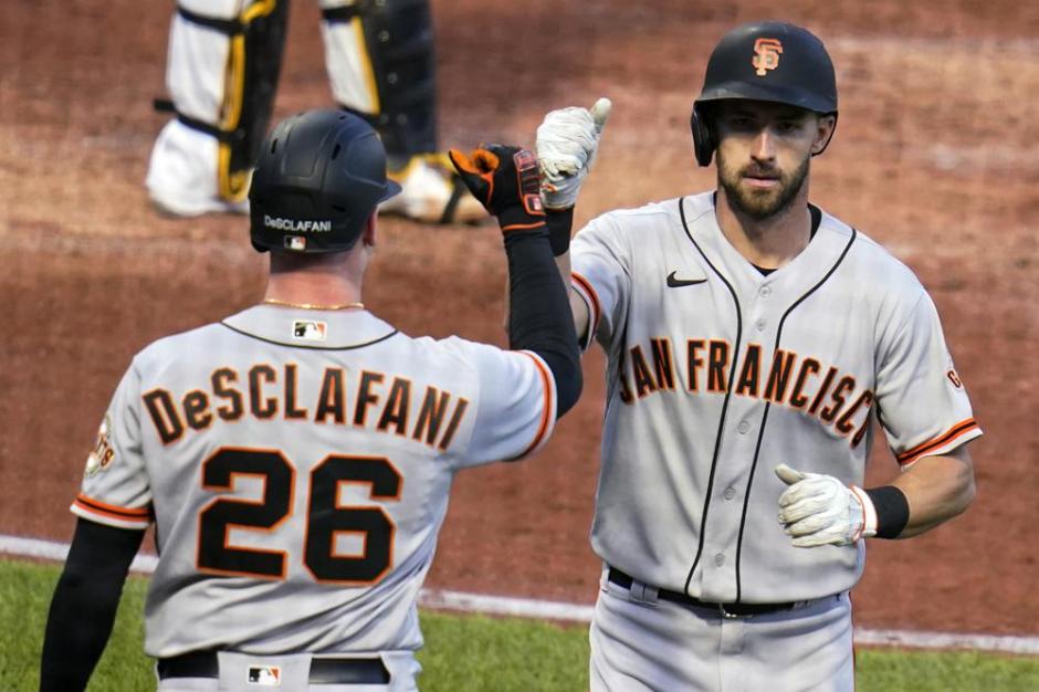 The San Francisco Giants Steven Duggar is greeted at home plate by Anthony DeSclafani after hitting a solo home run in the fifth inning at PNC Park in Pittsburgh against the Pittsburgh Pirates on Thu May 13, 2021 (AP News photo)