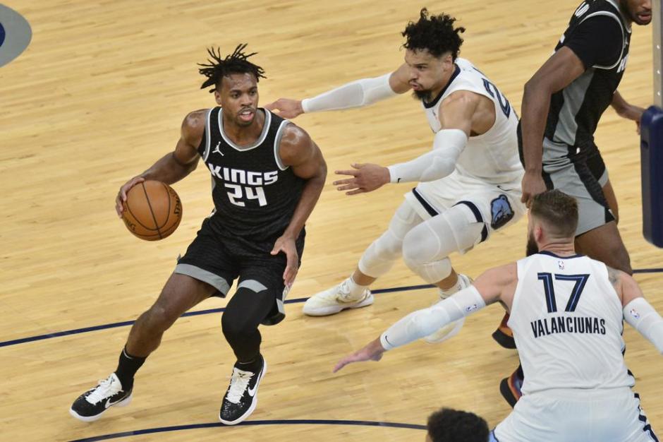 The Sacramento Kings Buddy Hield (24) drives against the Memphis Grizzlies Dillion Brooks (24) on Thu May 13, 2021 in Memphis (AP News photo)