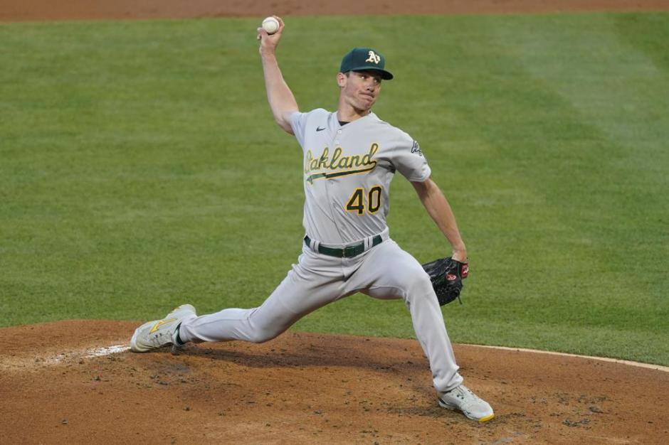 Oakland A’s starter Chris Bassitt throws against the Los Angeles Angels line up in the first inning on his way to a win at Angels Stadium on Sat May 22, 2021 (AP News photo)