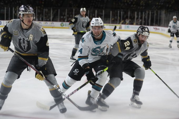 The San Jose Barracuda battling it out with the Henderson Silver Knights in game 2 of the Pacific Division Finals at Orleans Arena in Las Vegas on Sun May 23, 2021 (@sjbarracuda photo)