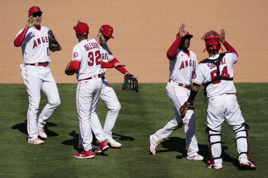 The Los Angeles Angels share congratulations after their come back win against the Oakland A’s at Angels Stadium in Anaheim on Sun May 24, 2021 (AP News photo)