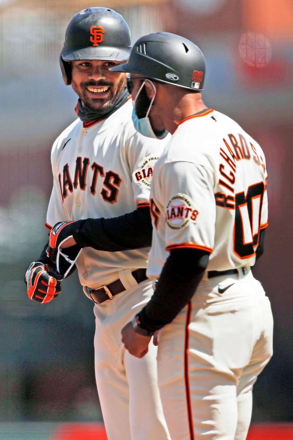 LaMonte Wade arrives at first base after hitting a single against the Colorado Rockies in second inning as he talks things over with first base coach Antoan Richardson (00) on Apr 11, 2021. Wade had played first base on Fri May 28th in Los Angeles from his usual outfield position (file photo from the San Francisco Chronicle)