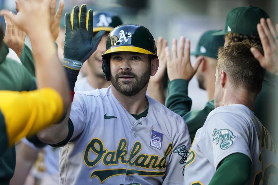 The Oakland A’s Mitch Mooreland gets congratulations in the dugout on Wed Jun 2, 2021 in Seattle after hitting a two run home run against the Seattle Mariners at T Mobile Park. Mooreland and the A’s will face the Colorado Rockies at Coors Field Fri Jun 3, 2021 (AP News photo)