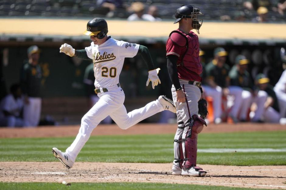 Oakland A’s Mark Canha (left) races past Arizona Diamondbacks catcher Carson Kelly (right) to score on a sac fly hit by Matt Olson in the seventh inning at the Ring Central Coliseum on Wed Jun 9, 2021 (AP News photo)