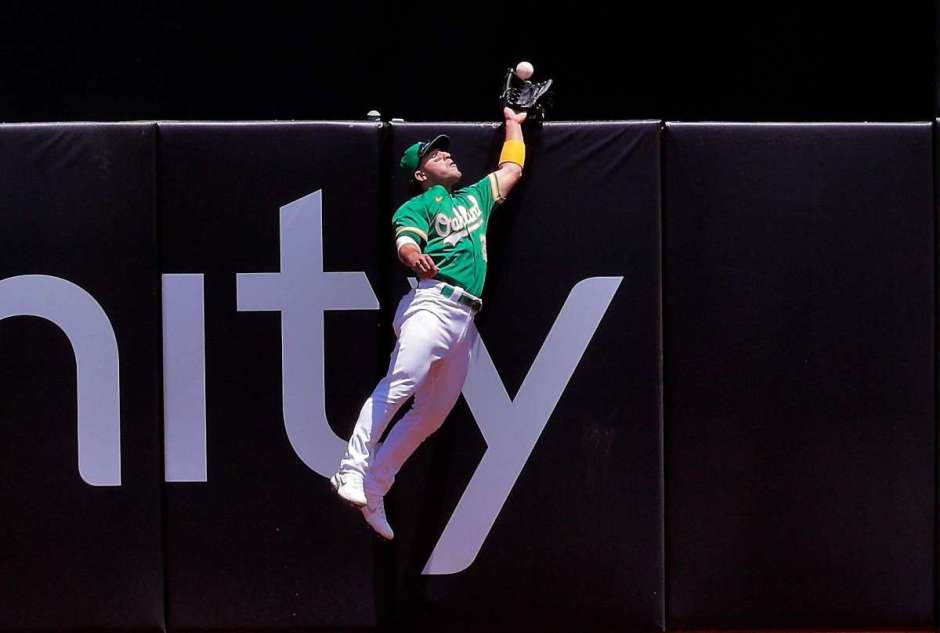 The Oakland A’s Ramon Laureano is back in the line up and look for him to make more of these exciting plays such as his over the fence fourth inning catch of the Los Angeles Angels Justin Upton at the Oakland Coliseum on Wed Jun 16, 2021 as Laureano and the A’s open a three game series in New York Fri Jun 18, 2021 (San Francisco Chronicle photo)