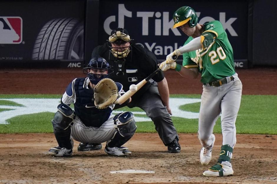 The Oakland A’s Mark Canha connects for a single in the seventh inning against the New York Yankees at Yankee Stadium in New York on Fri Jun 18, 2021 (AP News photo)