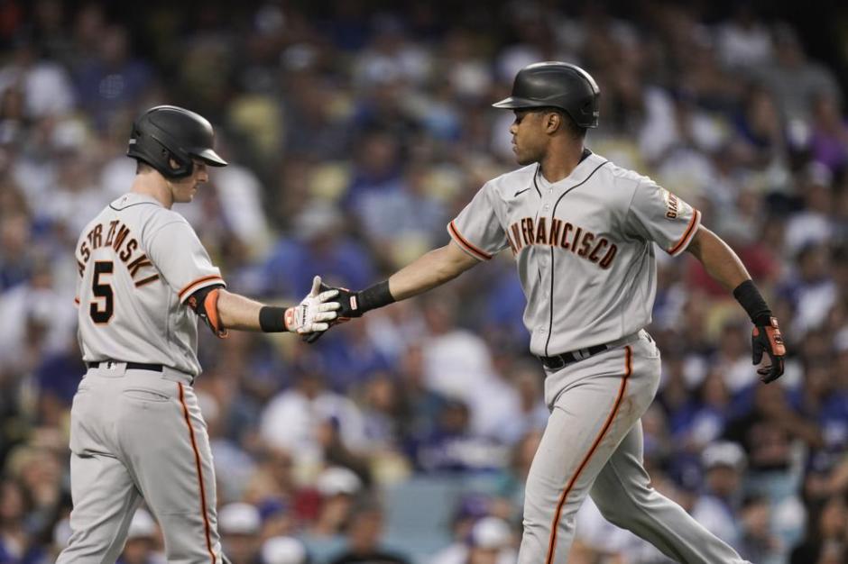 San Francisco Giants’ LaMonte Wade Jr., right, is congratulated for hitting a third inning home run by Mike Yastrzemski at Dodgers Stadium on Mon Jun 28, 2021, Yastrzemski is expected to be back in the line up Friday night against the Arizona Diamondbacks after suffering a contusion on Monday. (AP News photo)