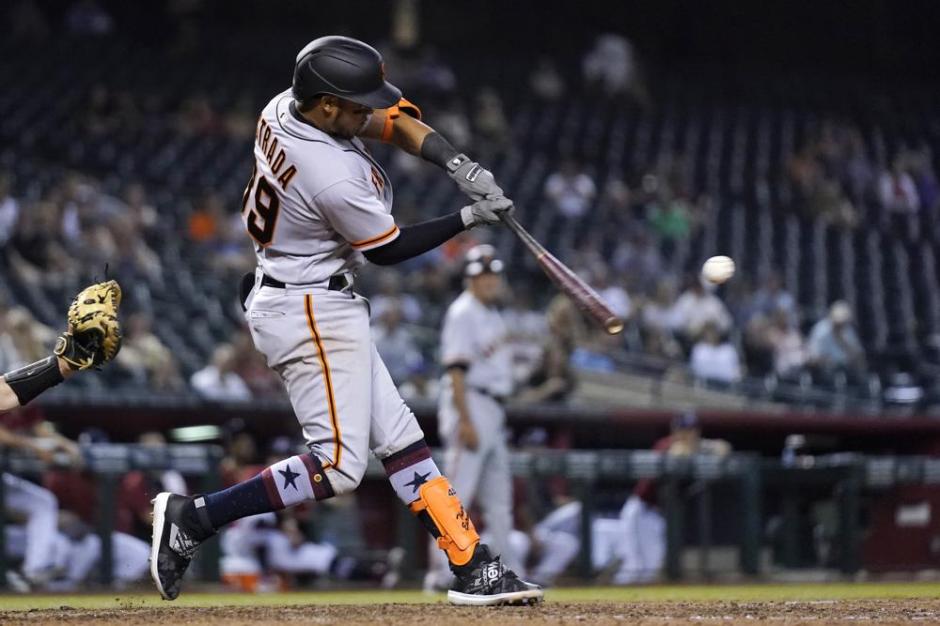 The San Francisco Giants Thairo Estrada belts out a ninth inning grand slam against the Arizona Diamondbacks at Chase Field in Phoenix on Fri Jul 2, 2021 (AP News photo)