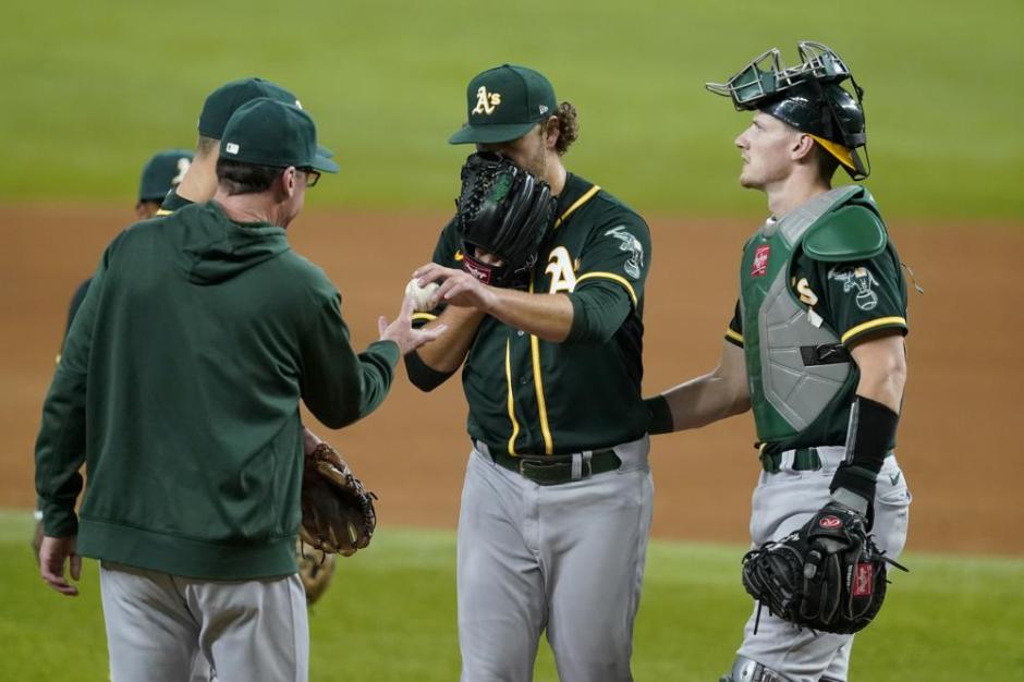Oakland A’s pitcher Cole Irvin gives up the ball to A’s manager Bob Melvin in the sixth inning at Globe Life Park in Arlington on Fri Jul 9, 2021 (AP News photo)