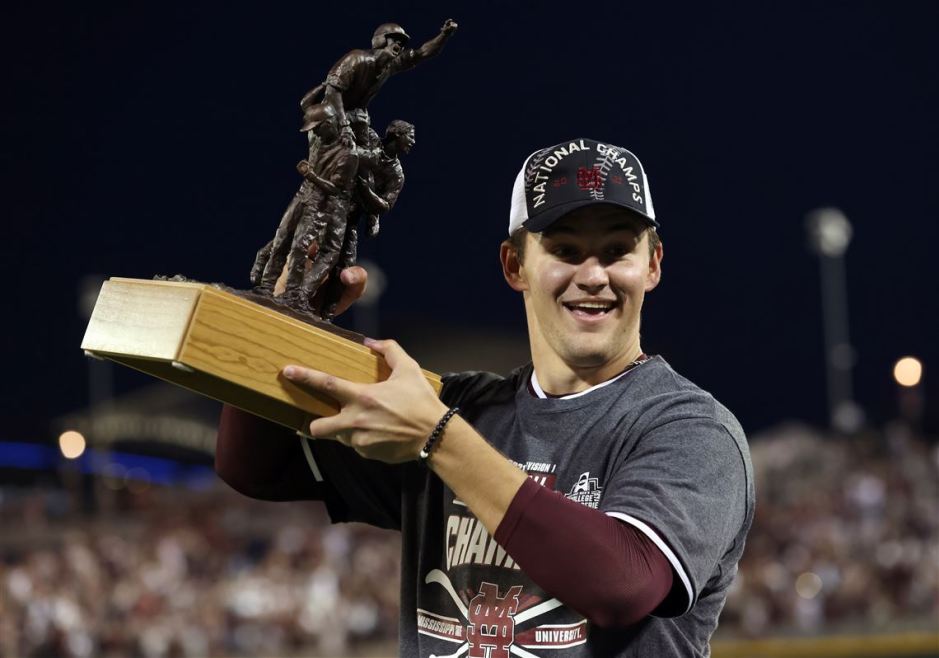Mississippi State Bulldogs pitcher Will Bednar was selected along with the San Francisco Giants 14th overall pick. Bednar was the MVP in the College World Series seen here hoisting the MVP Trophy (file photo from the Pittsburgh Post Gazette)