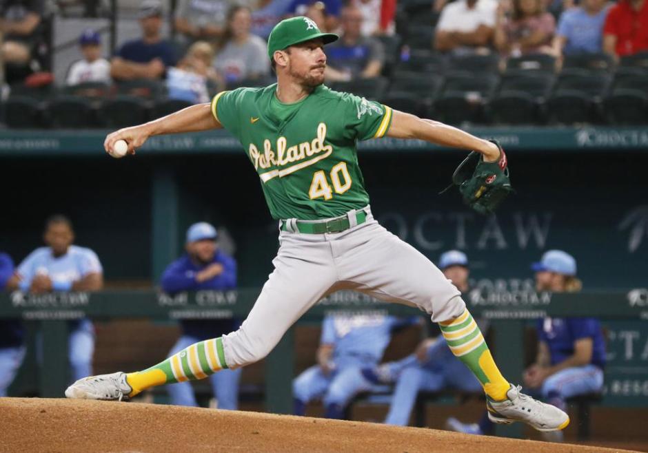 Oakland A’s starter Chris Bassitt seen here throwing to the Texas Rangers in Sun Jul 11, 2021 game is looking for his 11th win tonight at the Oakland Coliseum against Cleveland (AP file photo)