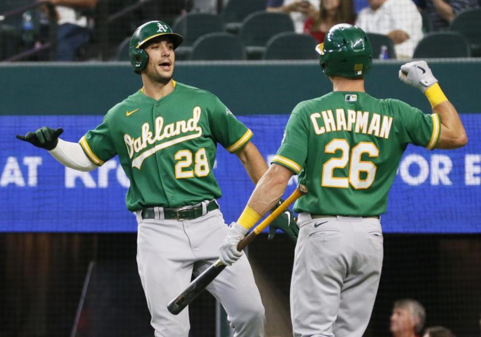 Matt Chapman (28) and Matt Olson (26) forearm bash after Chapman’s second home run of the night against the Texas Rangers in the sixth inning Sun Jul 11, 2021 at Arlington. Chapman and Olson are getting ready for the second half of the season opening up with Cleveland on Fri Jul 16, 2021 (AP file photo)